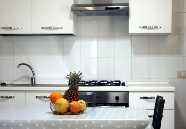 Alloggio trilocale piano terra; aria condizionata; tv; area giorno con angolo cottura e frigo; 1a camera con letto matrimoniale; 2a camera con letto a castello; bagno con doccia. Veranda esterna coperta attrezzata con tavolo e sedie.