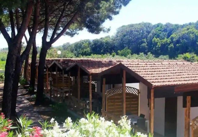casa mobile trilocale; aria condizionata; area giorno con angolo cottura, frigo a colonna; tv; 1a camera con letto matrimoniale; 2a camera con 2 letti singoli; bagno con box doccia e bidet. Veranda esterna coperta.