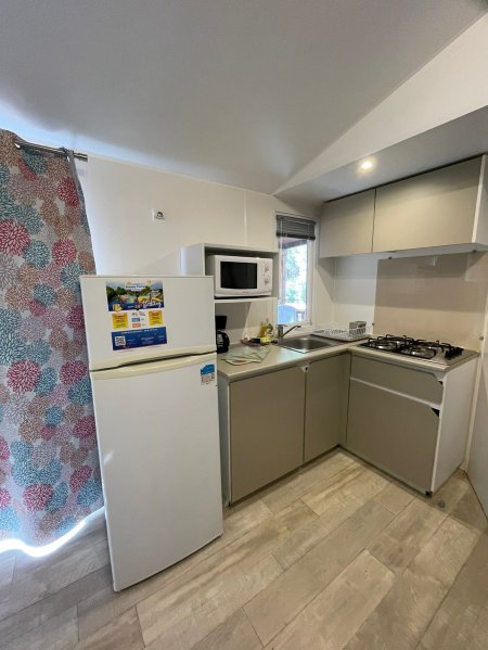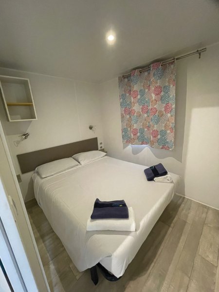 casa mobile; aria condizionata (su richiesta e a pagamento in loco); area giorno con angolo cottura, frigo con congelatore; 1a camera con letto matrimoniale; 2a camera con 2 letti singoli; 3a camera con 2 letti singoli; 1 posto letto ricavabile dal divanetto in area giorno; bagno con doccia (in alcune case mobili il wc è separato dalla zona doccia). Veranda esterna in legno semi-coperta, attrezzata con tavolo e sedie, due sdraio o sedie reclinabili. Piccola piastra elettrica.