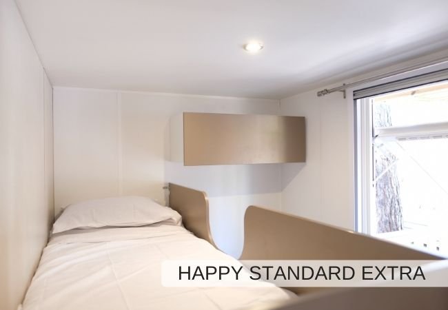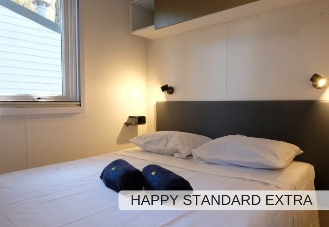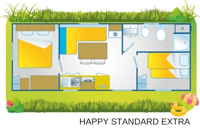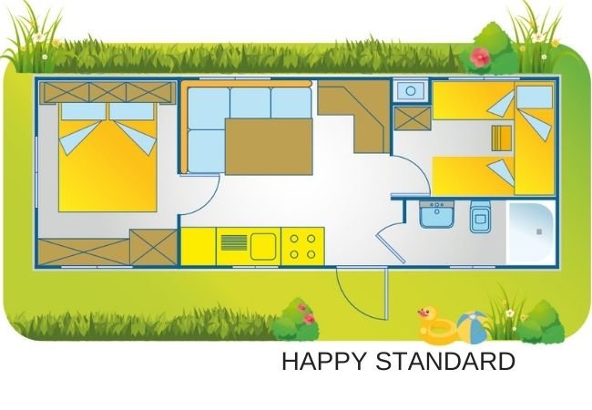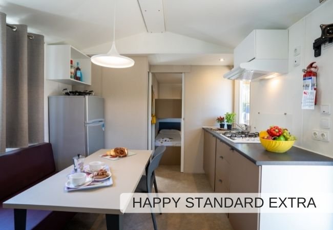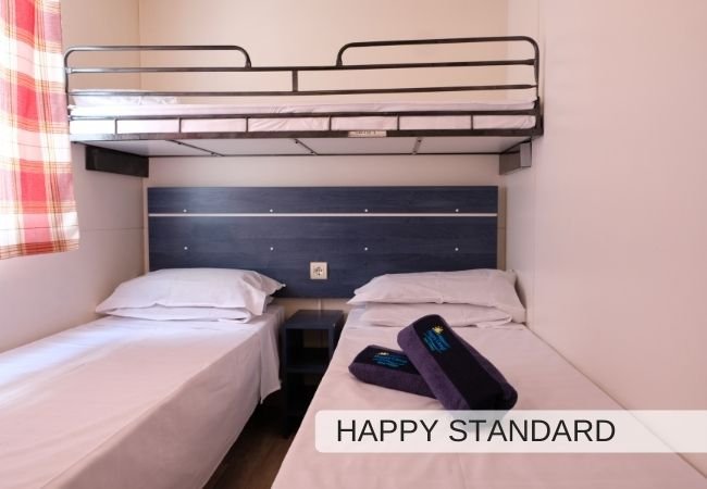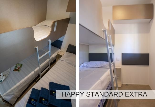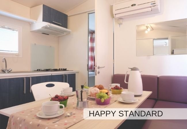 casa mobile; aria condizionata (su richiesta e a pagamento in loco); area giorno con angolo cottura, frigo con congelatore; 1a camera con letto matrimoniale; 2a camera 1 letto a castello (con il posto superiore adatto ad una persona di massimo 150 cm e 60 kg) ed 1 letto estraibile; 1 posto letto ricavabile dal divanetto in area giorno; bagno con doccia e bidet. Veranda esterna in legno semi-coperta, attrezzata con tavolo e sedie, due sdraio o sedie reclinabili.