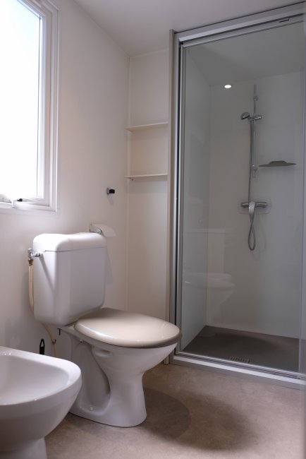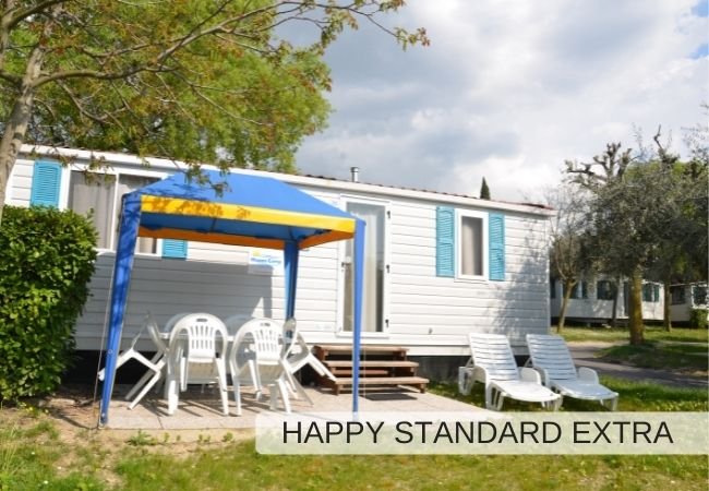 Casa mobile; aria condizionata (su richiesta e a pagamento in loco); area giorno con angolo cottura, frigo con congelatore; 1a camera con letto matrimoniale; 2a camera con 2 letti singoli; 3a camera con 2 letti singoli; 1 posto letto ricavabile dal divanetto in area giorno; 1° bagno con doccia, lavandino, wc ed asciugacapelli; 2° bagno (in camera con letto matrimoniale) con lavandino, doccia e wc. Veranda esterna in legno completamente coperta, attrezzata con tavolo e sedie, due sdraio o sedie reclinabili e poltrona pensile.